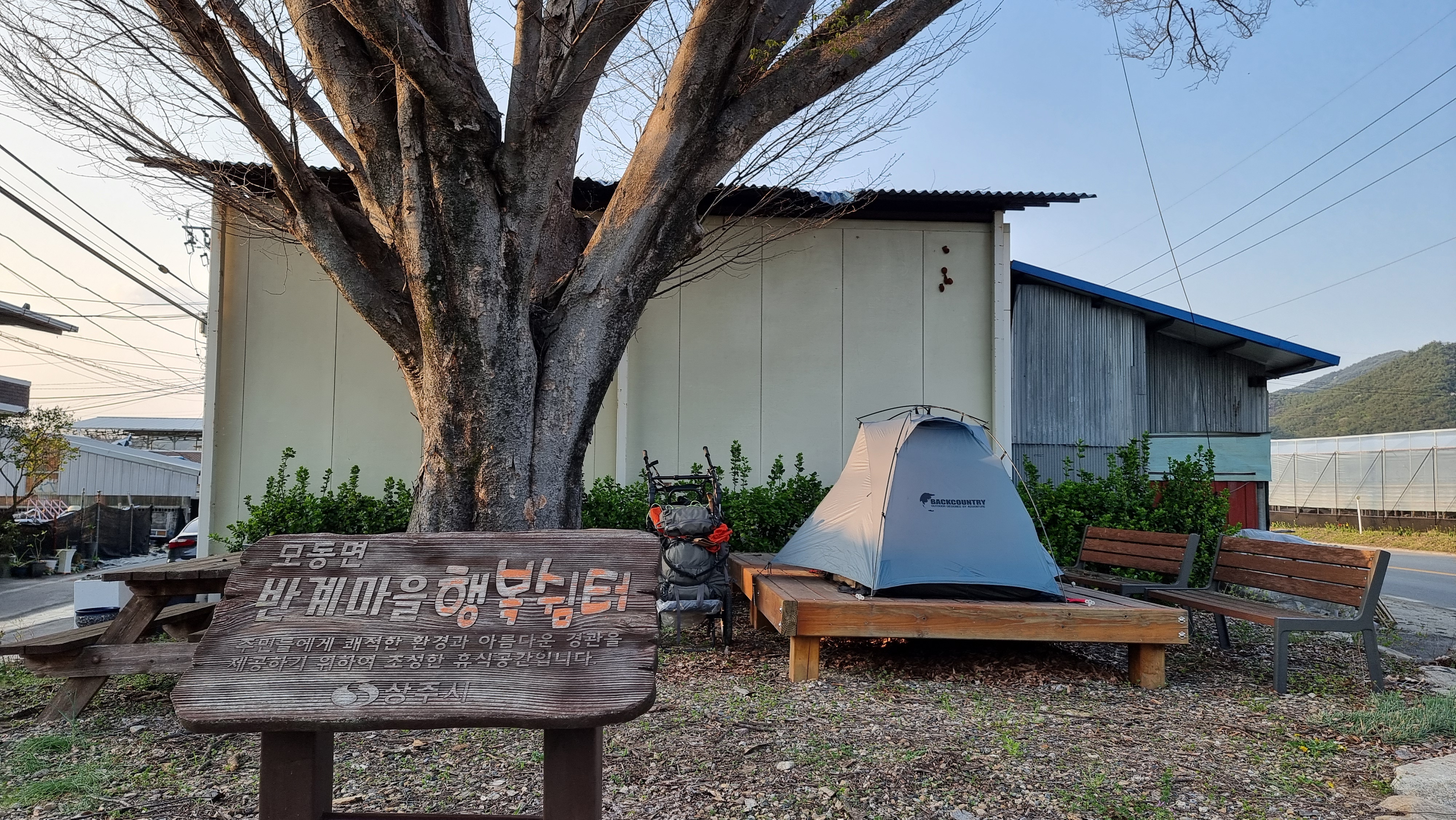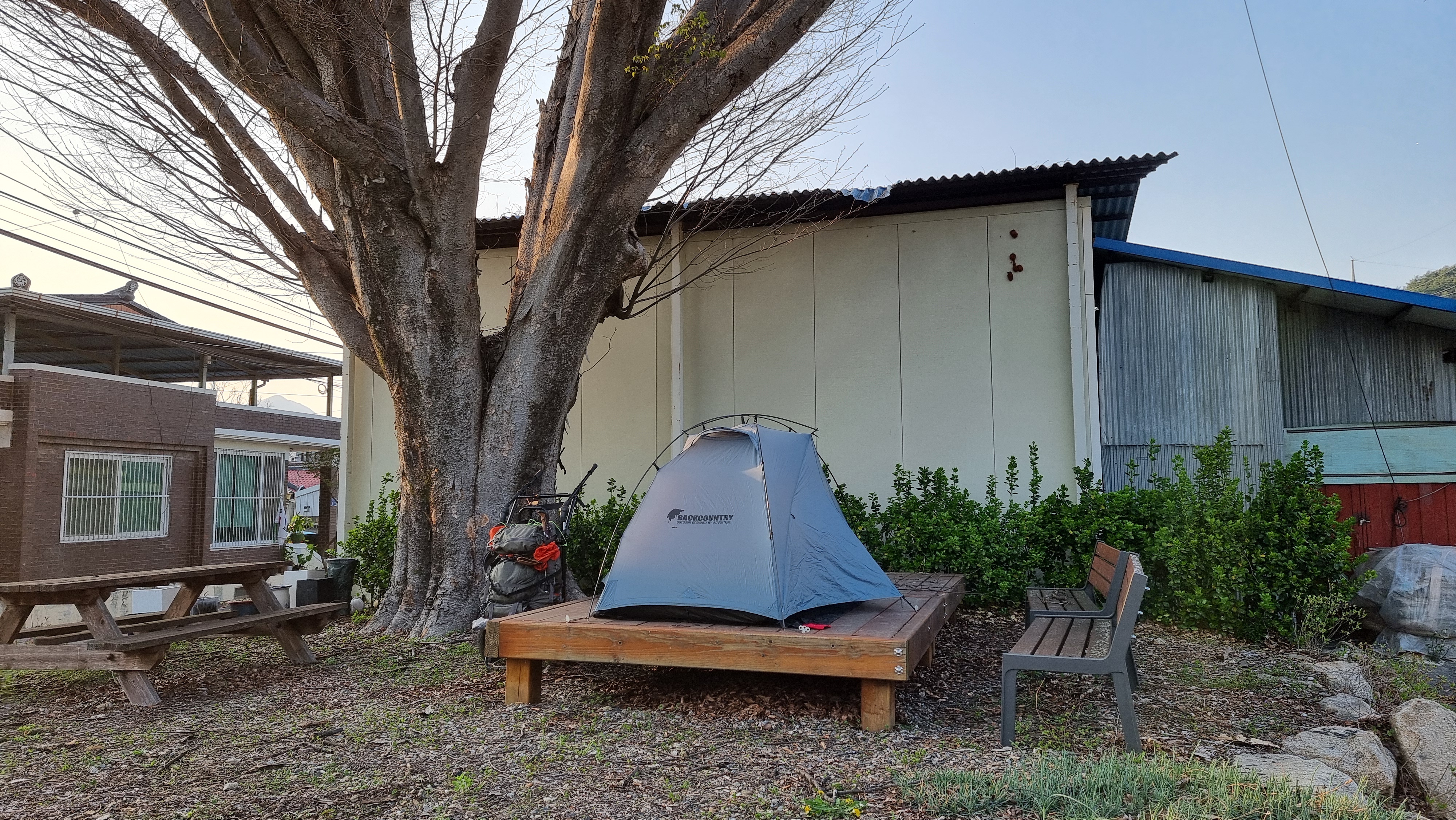 이곳에 평상이 있어서 이곳에 텐트를 쳤다.