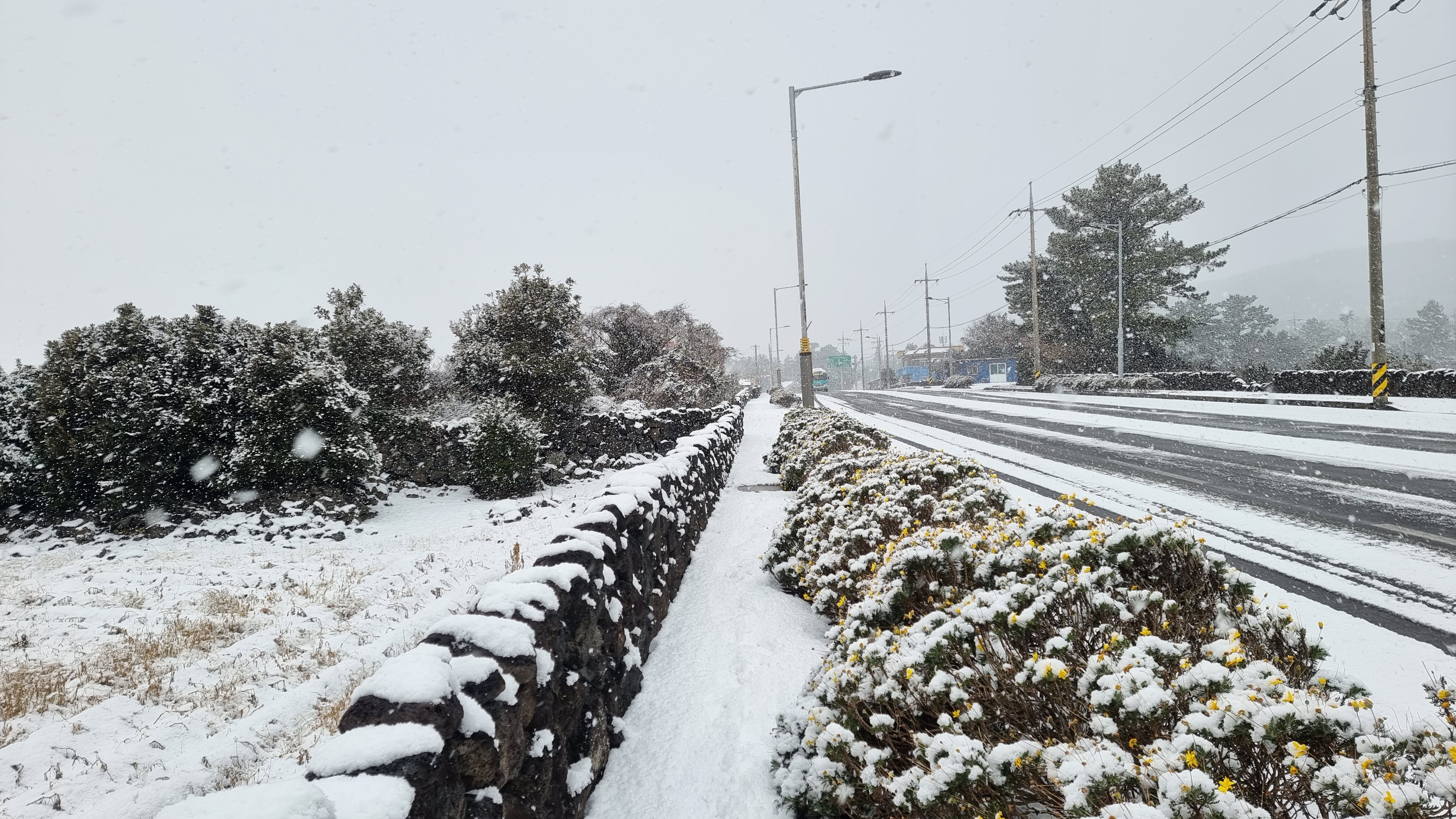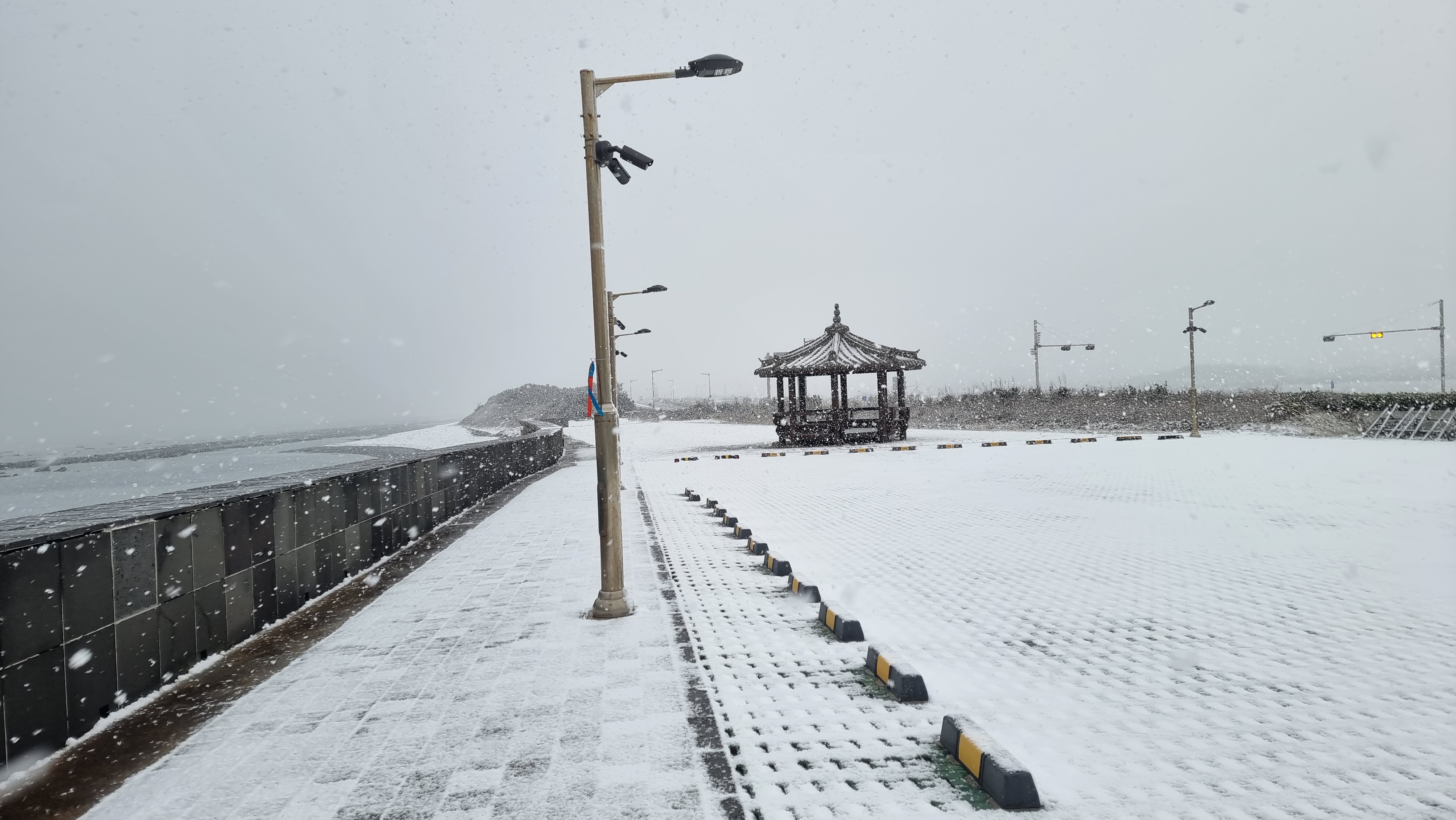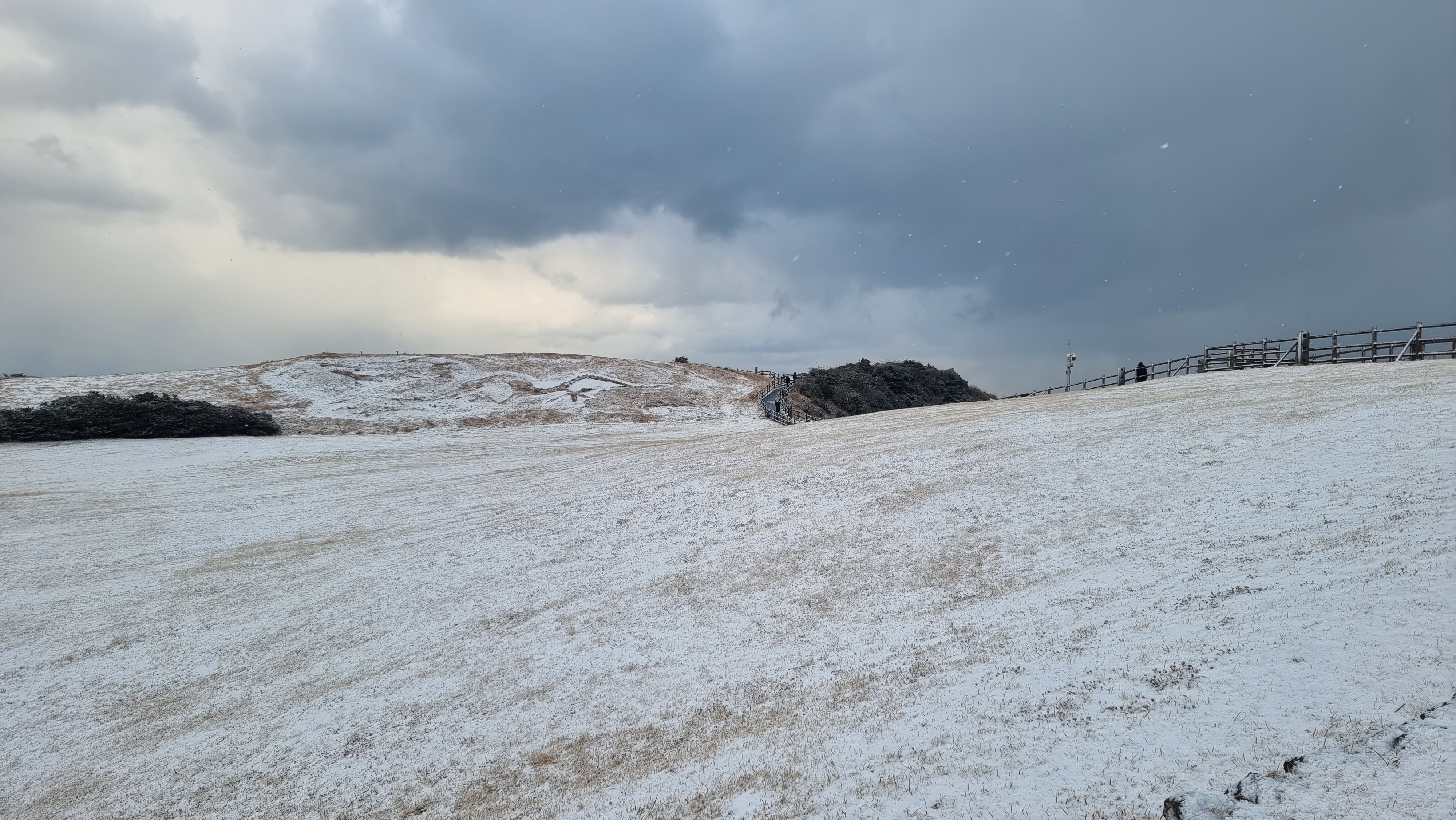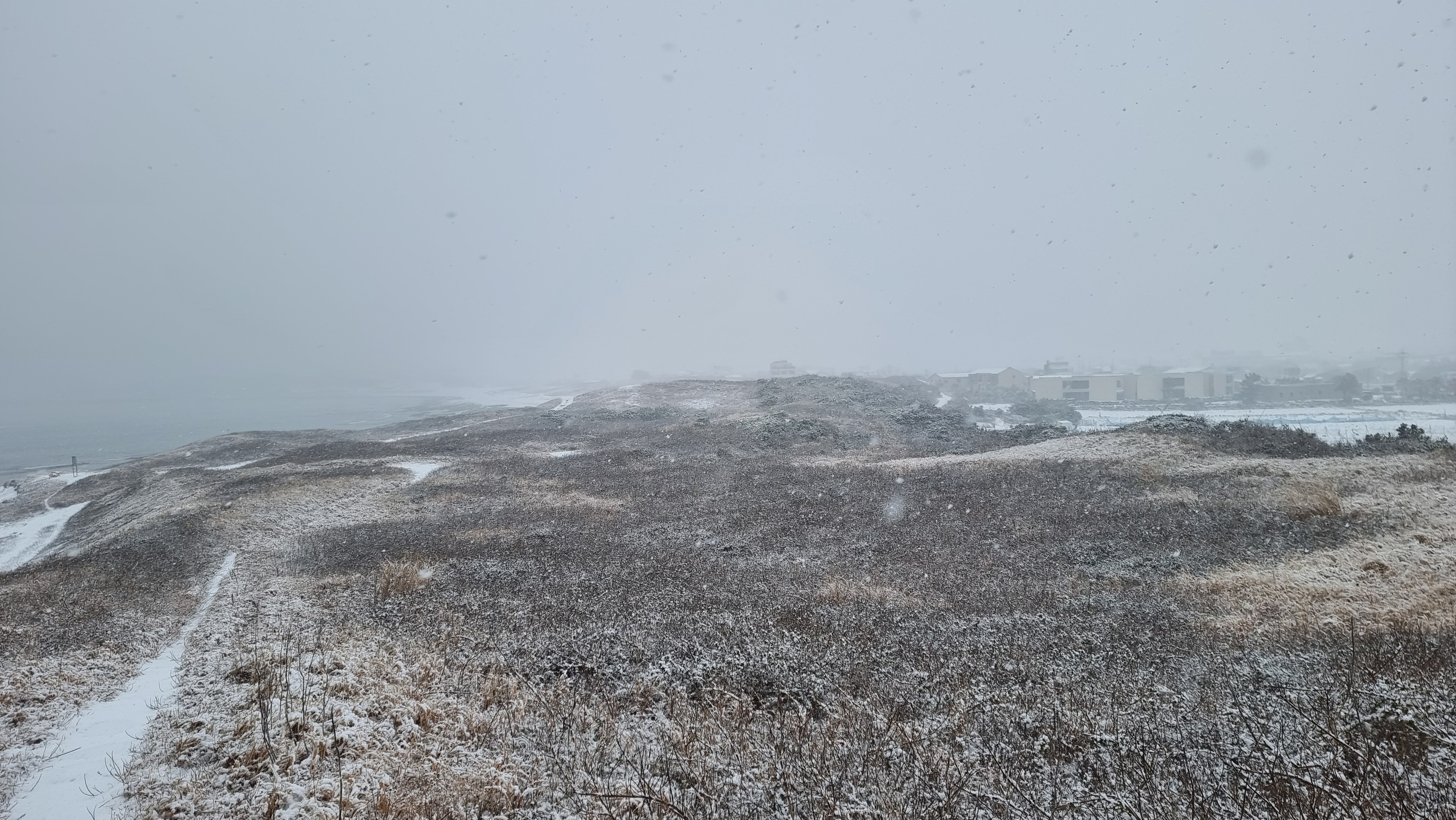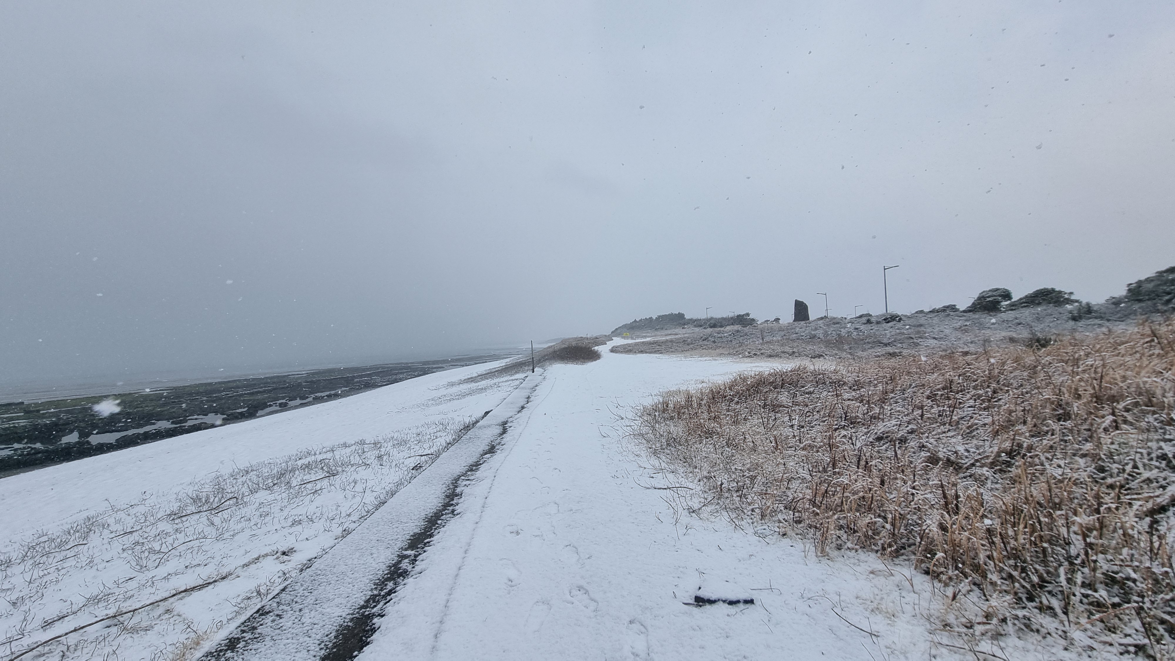 쏟아지는 눈을 맞으며 광치기를 걸어간다.