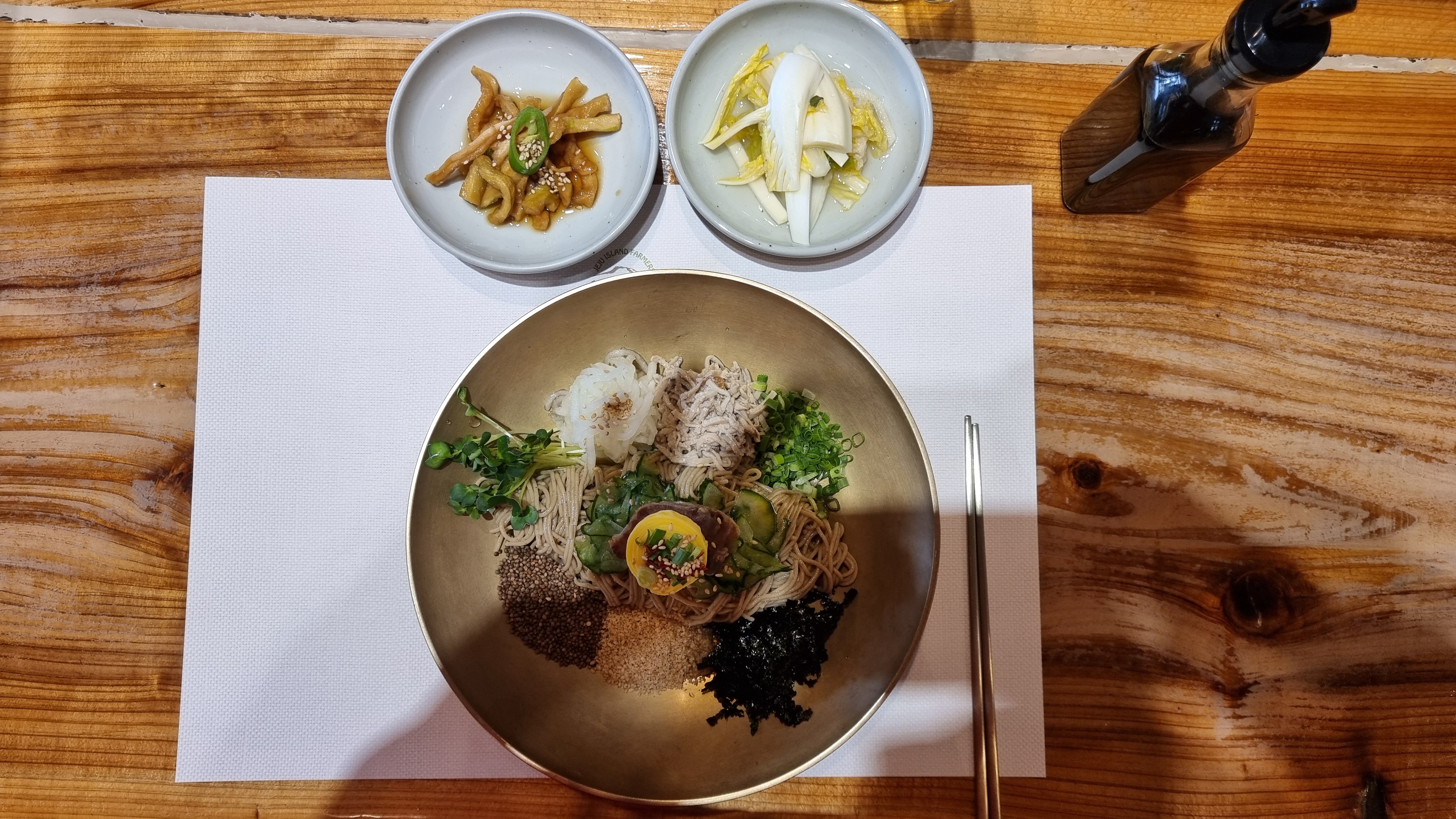 비빔밥처럼 메밀면에 무채와 버섯, 쪽파, 김 ,들깨,편육,계란지단 등을 주변에 깔고 들기름을 뿌린 음식이다. 비벼서 먹으면된다.