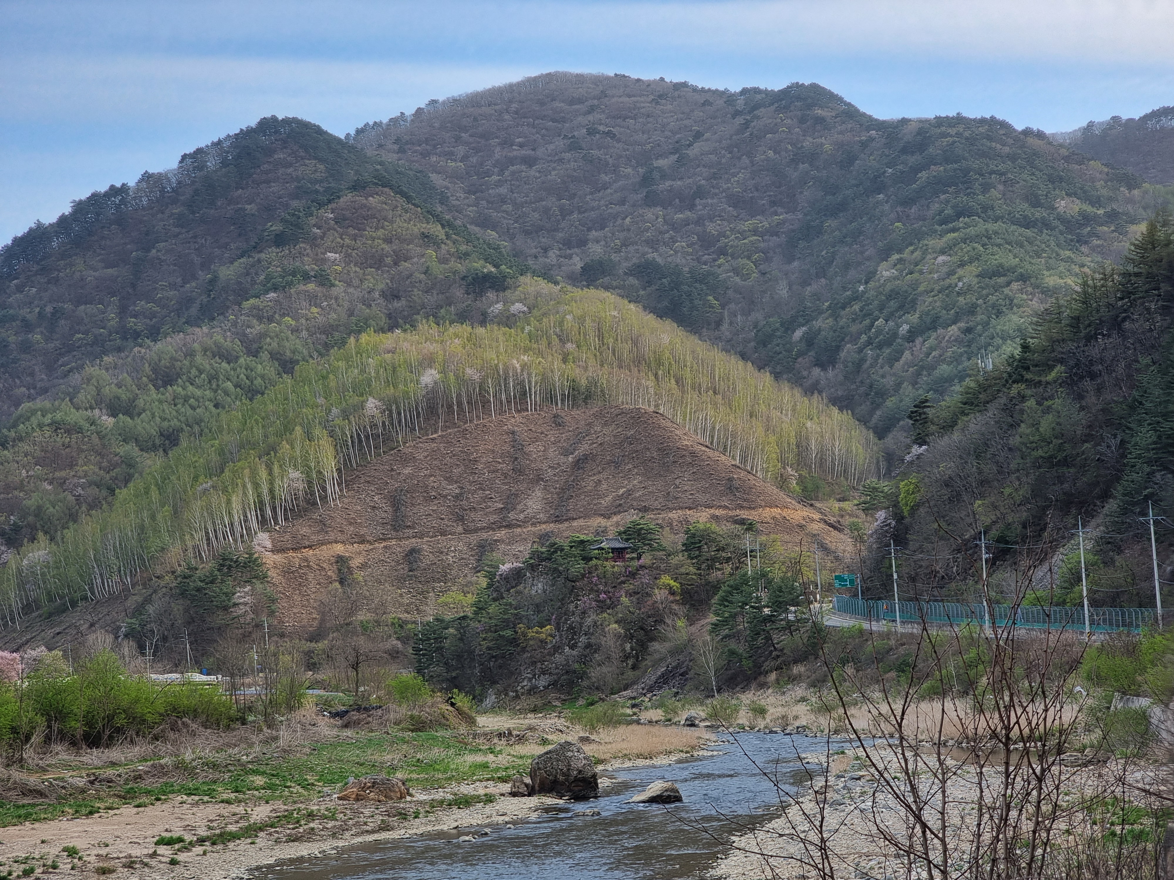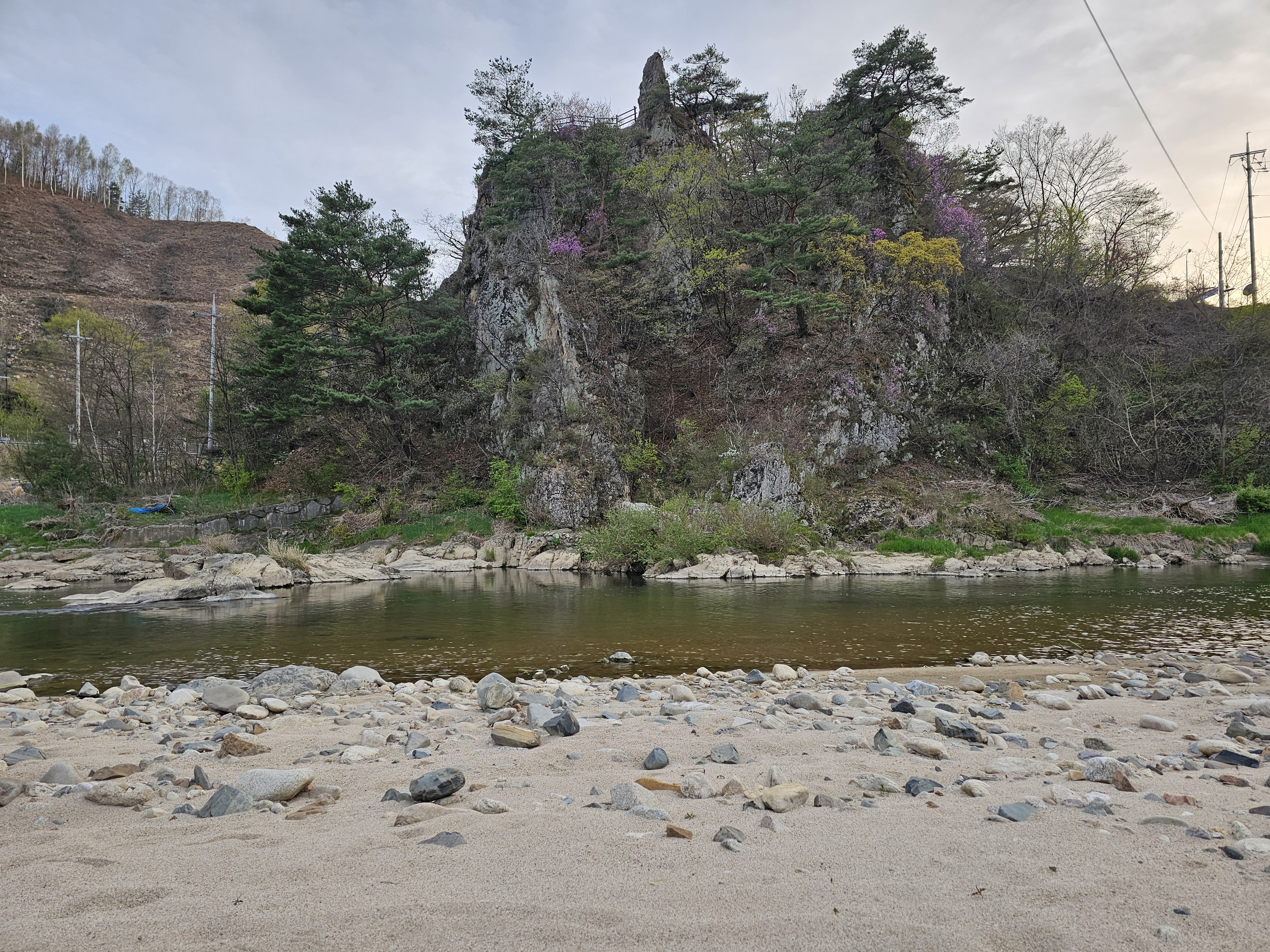 청심대에 올라가 오대천을 바라보니 오대천 백사장에 텐트를 치면 될것같다.