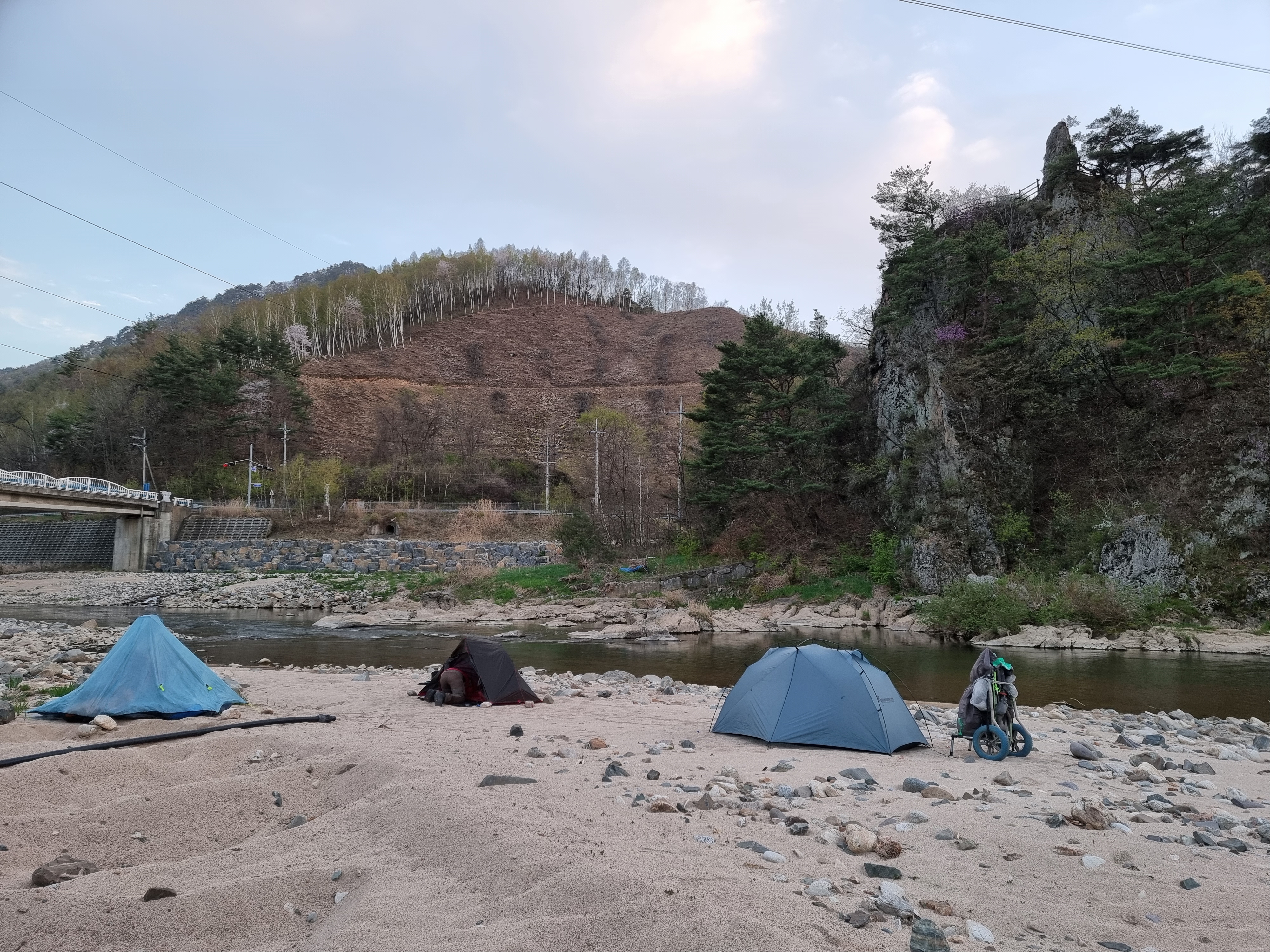 오랜만에 강가 백사장에 텐트를 쳤다.